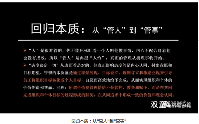 管理的本質(zhì)是管事而非管人:很多管理者把管理當成一種工具,認為管理是用來操控的,就必須操縱控制員工的行為。其實,是很難管的,你不能死死盯著一個人叫他做事情,員工內(nèi)心不配合盯著他也沒有成效,管人是典型人治,真正的管理從梳理事物開始。所以,管理的本質(zhì)管理不是管控、教條和賦予,而是在共同完成組織和個體目標的過程形成的默契,在共同追求中形成一致的價值和理念認同。