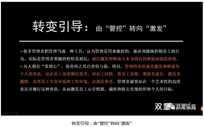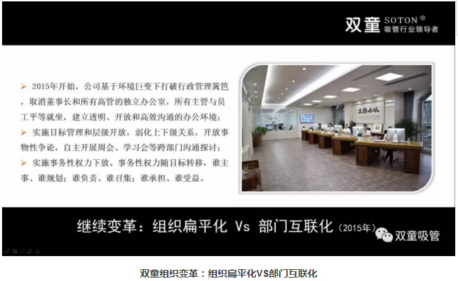 “雙童組織變革:基于時代的改變和挑戰(zhàn),雙童2015年開始,對原有組織形式進行思考、實踐和探索,逐漸打破行政管理籬笆,通過平等、透明、開放的辦公環(huán)境,消除部門之間的隔閡,實施目標管理和層級開放,弱化上下級關(guān)系,自主開展周會等跨部門溝通探討,提升部門工作效率。同時,實施事務(wù)性權(quán)力下放,大家以解決事務(wù)為核心,讓權(quán)力隨事務(wù)轉(zhuǎn)移,誰主事、誰規(guī)劃;誰負責、誰召集;誰承擔、誰受益,一切以工作結(jié)果為導(dǎo)向,也實現(xiàn)了跨部門互通互聯(lián)、共同探討!