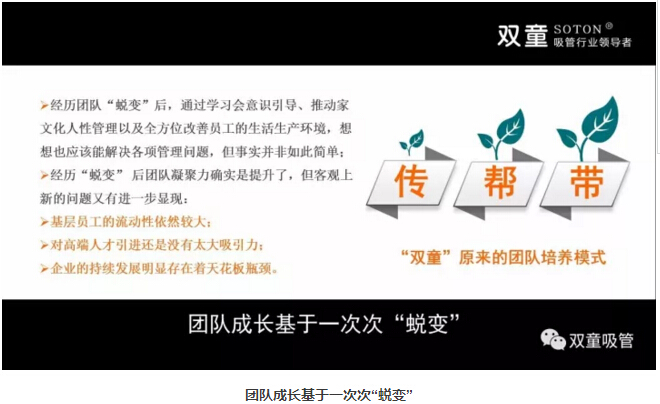 “雙童選擇了主動蛻變:基于上述瓶頸,公司在2011年發(fā)布了第三個《企業(yè)五年發(fā)展規(guī)劃》,明確再造經(jīng)理人計劃,明確領(lǐng)導(dǎo)層更替:選拔培養(yǎng)年輕領(lǐng)導(dǎo)層、重要崗位領(lǐng)導(dǎo)年輕化、明確實施股份制改革,慢慢解決管理層老化問題!重組后的雙童團隊平均年齡不到三十歲,大部分核心團隊的工齡在十年以上,學歷、知識層次和忠誠度大幅提高!