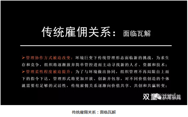 傳統(tǒng)管理模式,終結(jié)時代來臨:在新時代背景下,管理進入了信息管理時代,傳統(tǒng)雇傭關(guān)系面臨瓦解,管理協(xié)作方式逐漸改變,員工與組織的雇傭關(guān)系逐漸變成了共生關(guān)系。管理形式也將更加開放、創(chuàng)新并包容,對不同價值創(chuàng)造的個體就需要有足夠的靈活性,傳統(tǒng)雇傭關(guān)系逐漸向價值共享、共創(chuàng)和共贏轉(zhuǎn)變!
