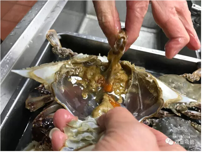 12、取出砂囊后將蟹身兩側(cè)的蟹鰓(看上去像魚鰓)用手工拔除干凈,如果蟹鰓底部有烏黑砂子,千萬(wàn)不要用清水沖洗,用干凈牙刷局部清洗一下就可以了。