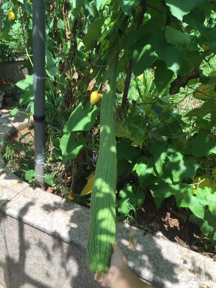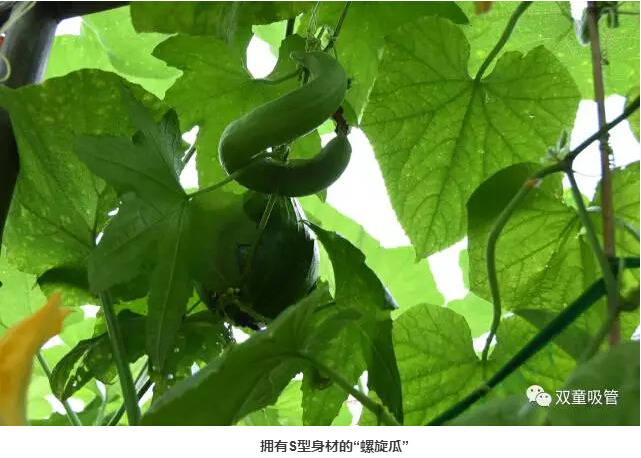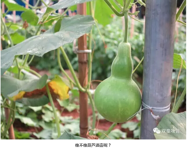 接下來這個瓜可是堪稱藝術品呢!一般的葫蘆瓜都是直筒的,而雙童菜園里的葫蘆瓜居然長成了一個名副其實的葫蘆瓜。吸管君直言,把瓜仁挖了,都可以當酒壺啦!