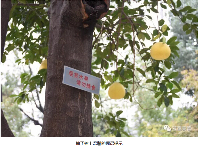 原來,為了雙童的生態(tài)和美觀,公司明確柚子是觀賞性水果,每棵柚子樹上都有觀賞水果,請勿摘食的字樣,提醒和引導(dǎo)員工不要摘食觀賞水果。