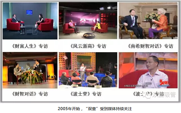 2006年開始,中央電視臺(tái)《新聞聯(lián)播》、《焦點(diǎn)訪談》、《財(cái)經(jīng)頻道》、《波士堂》等十幾家國(guó)內(nèi)權(quán)威媒體也關(guān)注到“雙童”,大量報(bào)道“雙童”節(jié)能降耗、員工關(guān)懷等經(jīng)營(yíng)理念。媒體的大量報(bào)道引發(fā)了社會(huì)各界對(duì)“雙童”的關(guān)注,一時(shí)間全國(guó)各地政府企業(yè)組團(tuán)來“雙童”參觀,光光2007年,“雙童”就接待了共3500位參觀者,在無形當(dāng)中為“雙童”品牌傳播創(chuàng)造了很好的傳播手段!