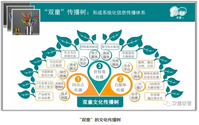 左邊是閃亮點(diǎn)的傳播介紹,包括了綠色制造、節(jié)能降耗、精細(xì)化管理以及技術(shù)創(chuàng)新等內(nèi)容。右邊通過微博、微信、博客、官網(wǎng)、百科等制造話題,即時(shí)發(fā)布博文、軟文、帖子等內(nèi)容,并進(jìn)行互聯(lián)網(wǎng)、IT推廣、展位推廣等自媒體的傳播。上邊則是政府、媒體關(guān)注的價(jià)值觀傳播。三大部分組成了“雙童”的文化傳播樹!