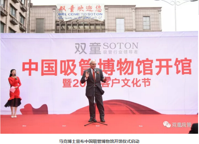 接下來(lái),主持人也邀請(qǐng)中國(guó)吸管博物館名譽(yù)館長(zhǎng)馬克博士上臺(tái)發(fā)言。其實(shí),馬克博士從2005年開(kāi)始就關(guān)注雙童吸管,先后5次采訪(fǎng)雙童,與雙童樓仲平成為了多年摯友,在雙童的發(fā)展和成長(zhǎng)過(guò)程中有著重大影響。此次馬克博士也是不遠(yuǎn)萬(wàn)里專(zhuān)程從美國(guó)紐約飛到北京再輾轉(zhuǎn)至義烏,為的就是和所有嘉賓共同見(jiàn)證中國(guó)吸管博物館開(kāi)館!最后,馬克博士也鄭重宣布中國(guó)吸管博物館開(kāi)館儀式正式啟動(dòng)!
