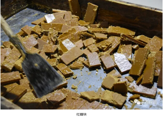 在參觀體驗的過程當(dāng)中,“敲糖幫”陳總也親自帶隊和大家介紹了紅糖的制作過程和琳瑯滿目的紅糖產(chǎn)品。在陳總的介紹當(dāng)中,我們得知義烏紅糖都是由古法制作而成。首先,用牛拉木車絞蔗汁(現(xiàn)在用先進的榨糖機器),然后用鍋爐燒一字排開的九連糖鍋,糖鍋直徑依次由大到小。接著,把絞出的糖水放入第一口最大的鍋中燒煮,一步步讓水分慢慢蒸發(fā)干凈,當(dāng)糖水蒸發(fā)到一定時候,煎熬的糖水變成了金黃色,在鍋中冒著濃稠而滾圓的泡泡,幾個熬糖師傅用長柄鐵勺不停地攪動糖鍋,防止稠糖焦鍋底,直到將全部濃稠的糖漿起到最末端的一口鍋中熬好,再舀到一個長方形的木制槽床上,制作成品質(zhì)高端的敲糖幫紅糖,這些紅糖可以加工成麻花等紅糖產(chǎn)品。