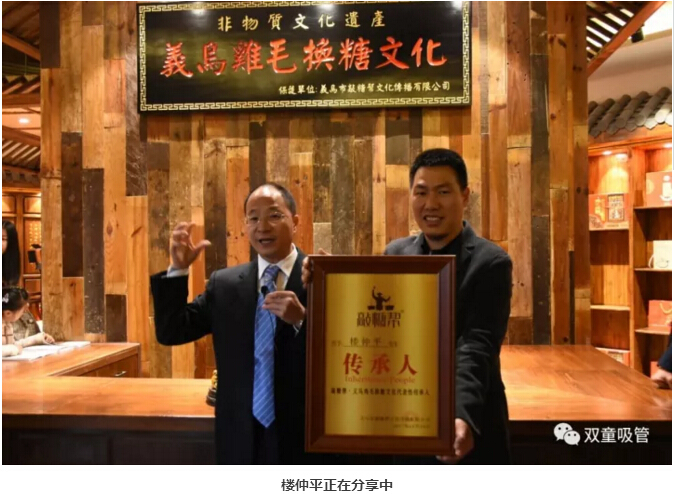 在分享環(huán)節(jié)時,“敲糖幫”李總為末代貨郎樓仲平授予了義烏“雞毛換糖”文化代表性傳承人的榮譽稱號。有客戶也在現(xiàn)場問“雞毛換糖”中的雞毛是事干什么用的?樓仲平也在現(xiàn)場親身分享“雞毛換糖”中雞毛的用途。