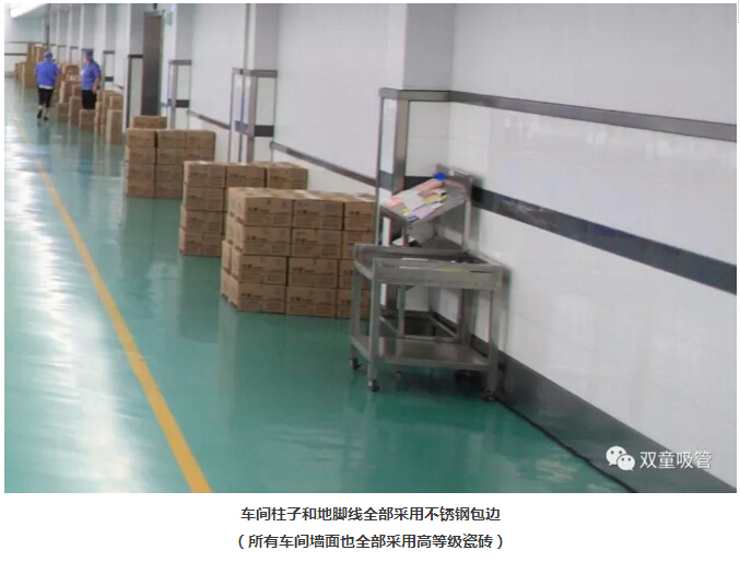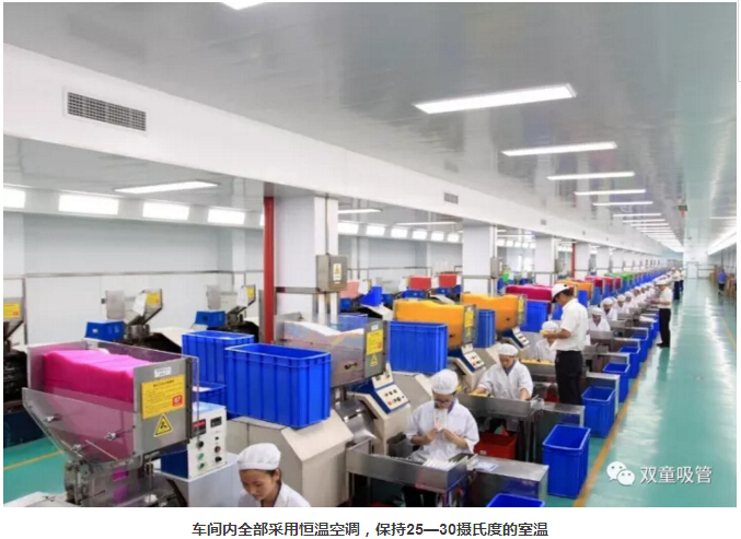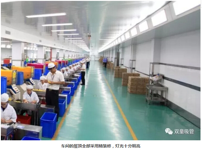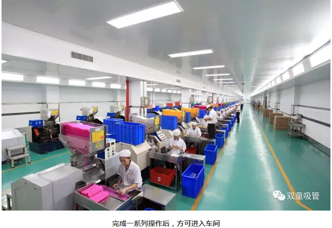 “雙童”車間的每個(gè)入口,有著許多安全、衛(wèi)生提示的標(biāo)牌,引導(dǎo)員工門在進(jìn)入車間時(shí)要注意安全和衛(wèi)生防護(hù)工作。進(jìn)入車間內(nèi)部,一列列整齊的機(jī)器、一箱箱五顏六色的吸管、一條條清晰分明的分界線,車間內(nèi)全部安裝了恒溫空調(diào),屋頂全部進(jìn)行精裝修寬敞明亮,柱子和地腳線用不銹鋼進(jìn)行包邊,大大增加了建筑年限。所有員工皆穿著潔白的工作服,正在忙碌地進(jìn)行生產(chǎn)工作。
