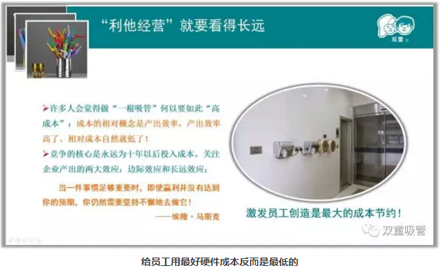 許多媒體在關(guān)注報(bào)道“雙童”時(shí),都會(huì)提到“雙童”的“GMP”食品標(biāo)準(zhǔn)設(shè)計(jì)建造的全封閉清潔車間,講述我們對生產(chǎn)環(huán)境的高投入和對員工衛(wèi)生防護(hù)的高要求。實(shí)際上,許多民營企業(yè)都不理解,吸管這樣的附屬產(chǎn)品在小作坊也能做,為何“雙童”卻要下如此高成本建設(shè)食品標(biāo)準(zhǔn)的生產(chǎn)車間呢?