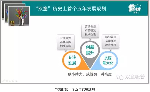 所以,“雙童”在這樣的背景下,提出了“以小博大,成就另一種高度”這句企業(yè)座右銘,來引領(lǐng)和激勵企業(yè)的發(fā)展。正是在這句座右銘的引導(dǎo)下,“雙童”摒棄了浮躁,抗拒了誘惑,通過不斷地努力、進(jìn)取和創(chuàng)新,把一根小小的吸管做到極致,做成了全球吸管領(lǐng)導(dǎo)者!